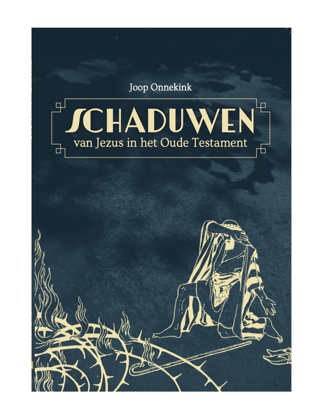 Onnekink, Joop'En toekomstige gebeurtenissen werpen hun schaduwen vooruit' De Schotse dichter Thomas Campbell (1777-1844) schreef: 'And coming events cast their shadows before.' Na acht jaar studie aan de Brandpunt Bijbelschool in Doorn was Joop Onnekink diep overtuigd van die waarheid. Hij had geleerd hoe overweldigend veel schaduwen van Jezus Christus, de Messias, te vinden waren in wat we het Oude Testament noemen, de Hebreeuwse Bijbel. Je leest er vooraf- schaduwingen in de levens van personen zoals Abraham en Izak, Jozef en Boaz, de losser van het verkochte erfdeel. Ook offers, wetten zoals over de vrijsteden en voorwerpen als de Tabernakel met daarin de ark van het Verbond en de menora blijken prachtige inzichten te geven in de persoon en het verlossingswerk van onze Heer. Heel bijzonder zijn de voorverschijningen van Jezus zoals in de gedaante van de Engel van de HEERE. De illustraties in het boek zijn van de Joodse Jugendstulkunstenaar Ephraim Moshel Lilien, die i8n 1906 werkte aan de kunstacademie Bezalel te Jeruzalem.