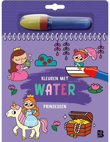 Ik kleur met waterMet dit boek vol prinsessen is er echte magie in het spel! Vul de bijhorende pen met water en kleur ermee op de pagina’s. Alle kleuren komen tevoorschijn. Nadat alles weer is opgedroogd, verdwijnen de kleuren weer zodat je elke keer opnieuw kunt beginnen. Bij elke tekening staan ook enkele zoekvraagjes die je pas kunt oplossen wanneer je alle details tevoorschijn hebt getoverd.Ideaal voor kleuters om te leren kleuren, zonder kans op vlekken.