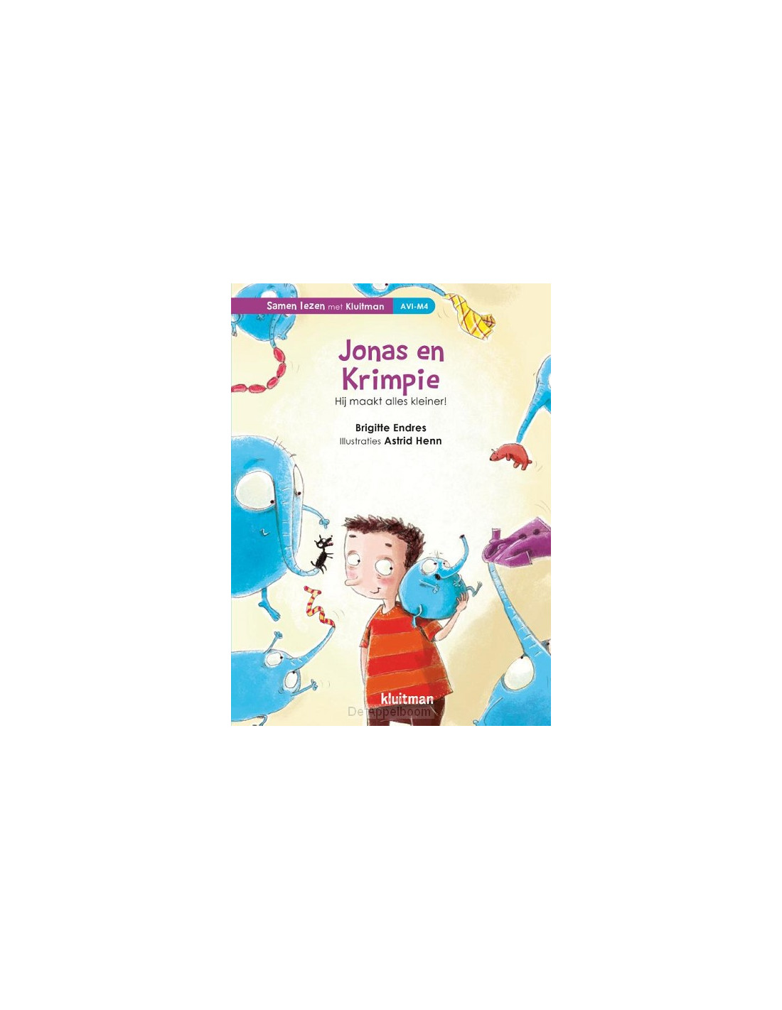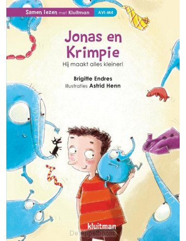 Endres, BirgitteIn de serie 'Samen lezen met Kluitman' lezen volwassene en kind met elkaar. De verhalen in deze serie zijn voor het merendeel voorleesverhalen, met af en toe stukjes tekst op AVI-niveau, die het kind zelf kan lezen. Ideaal voor kinderen die moeite hebben met lezen of nog niet zo veel plezier beleven aan het lezen. Zo wordt lezen een gezamenlijke activiteit voor voorlezer en kind!In Jonas en Krimpie is opeens alle was gekrompen. Jonas ziet een slurfje uit de wasmachine hangen. Het slurfje blijkt van Krimpie te zijn, een klein blauw monstertje dat alles kan laten krimpen - en daarbij zelf gigantisch groot wordt. Al snel zijn Jonas en Krimpie vriendjes. Ook al zorgt Krimpie soms voor problemen...
