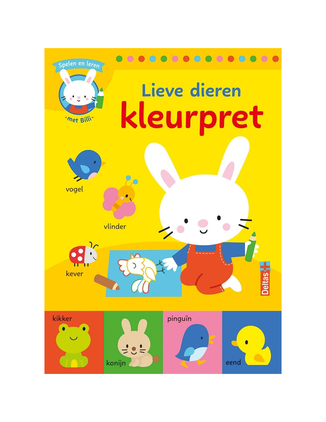 ZNUDit leuke kleurblok van Billi het konijntje staat boordevol lieve dieren om in te kleuren. Een hond, een leeuw, een vlinder of een koe... Dankzij de tekeningen met dikke, gekleurde lijnen kan je kind gemakkelijk aan de slag. Bij elke tekening staat bovendien het juiste woord zodat je kind al kleurend de woordenschat vergroot.