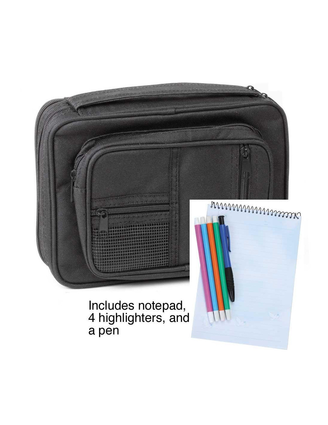 aan de achterkant dat wordt geleverd met een 15,24x22,86 cm spiraalgebonden gelinieerd notitieblok, plus vier markeerstiften en een pen.