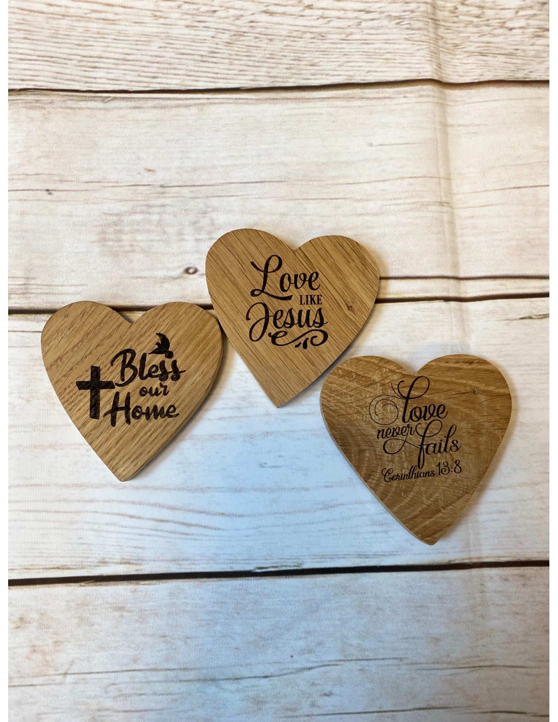 Koelkastmagneet (3) Houten harten assorti met gelaserde tekst.