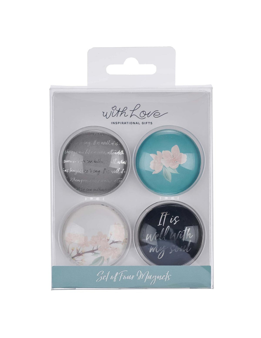 Magnet set - 4 glass magnets'It is well with my soul' - a powerful refrain - is the message of this set of four glass magnets. The glass magnets feature delicate branches of blush-pink orchids and foam green hues. Thick, silvery cursive and shimmering backgrounds create a sense of serenity and calm that is reflected in whole It Is Well Collection. The message displayed on the magnets will extend the sense of calm to your life every time you catch a glimpse of its truth: 'It is well with my soul.'