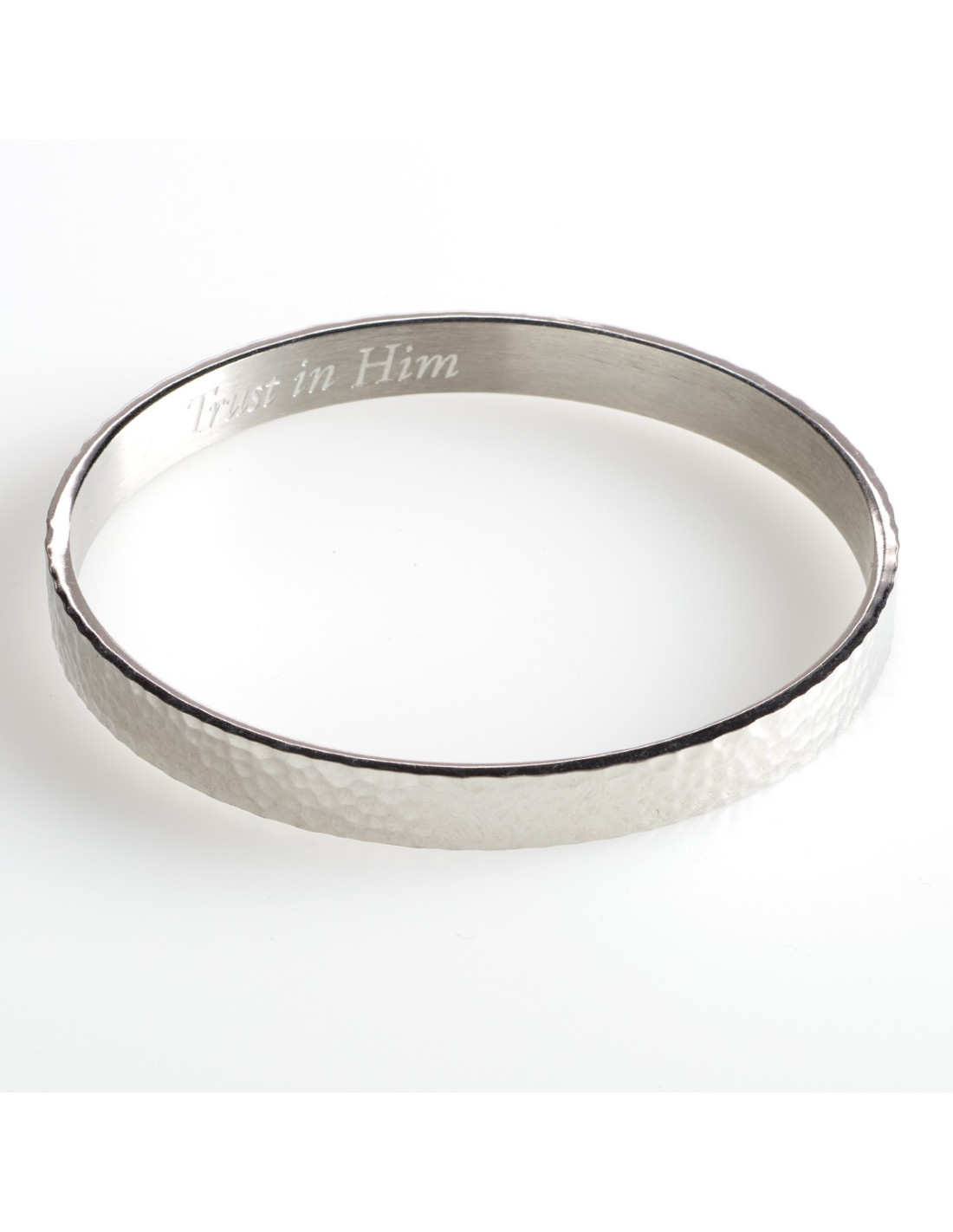 The Proverbs 3:5 Bangle Bracelet is made of 316 stainless steel with rhodium plating, and the 'Trust in Him' message is laser engraved on the Trust In Him Bracelet's interior, and the exterior of the Christian bracelet has a hammered metal finish.