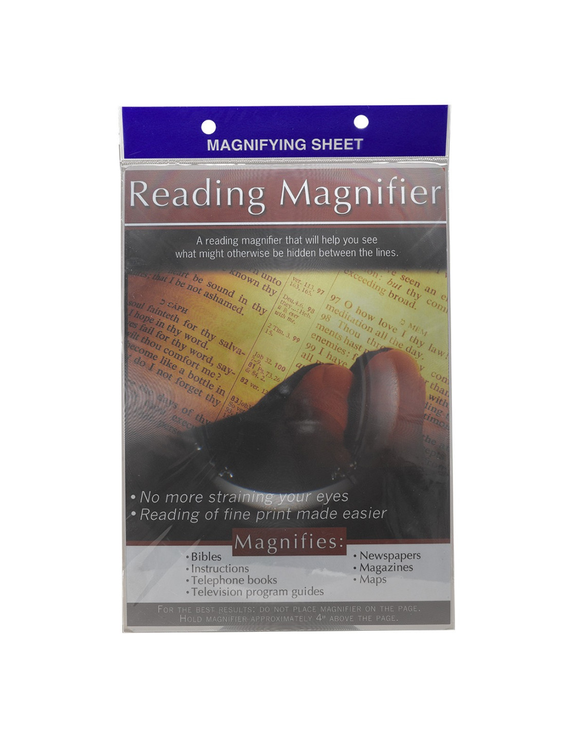 MagnifierMagnifying sheets are a handy for people with low vision. It is ideal for reading or inspecting small print or images. It might help you see what might otherwise be hidden between the lines. Our magnifying sheets are thin and flexible. Simply hold the page sized magnifying sheet about 10 cm above a page to magnify. Our magnifying sheets are thin enough to be left between the pages of a book without causing it to bulge - doubling as a bookmark!