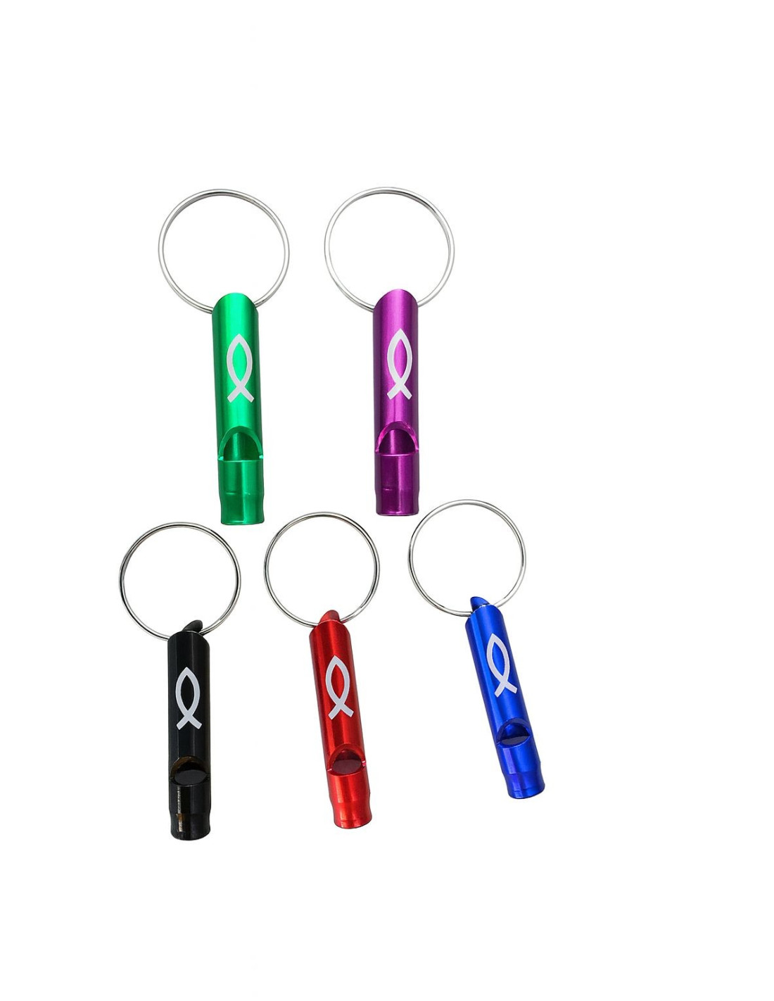 Sleutelhanger alluminium fluitje met tekst: 'Ichtus' assortie kleuren.