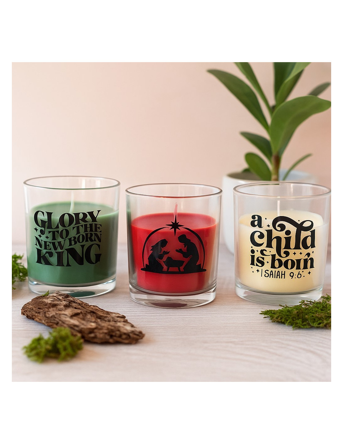 Kaars in glas Nativity Child Glory diverse kleuren. Afmeting: 7 cm hoog.