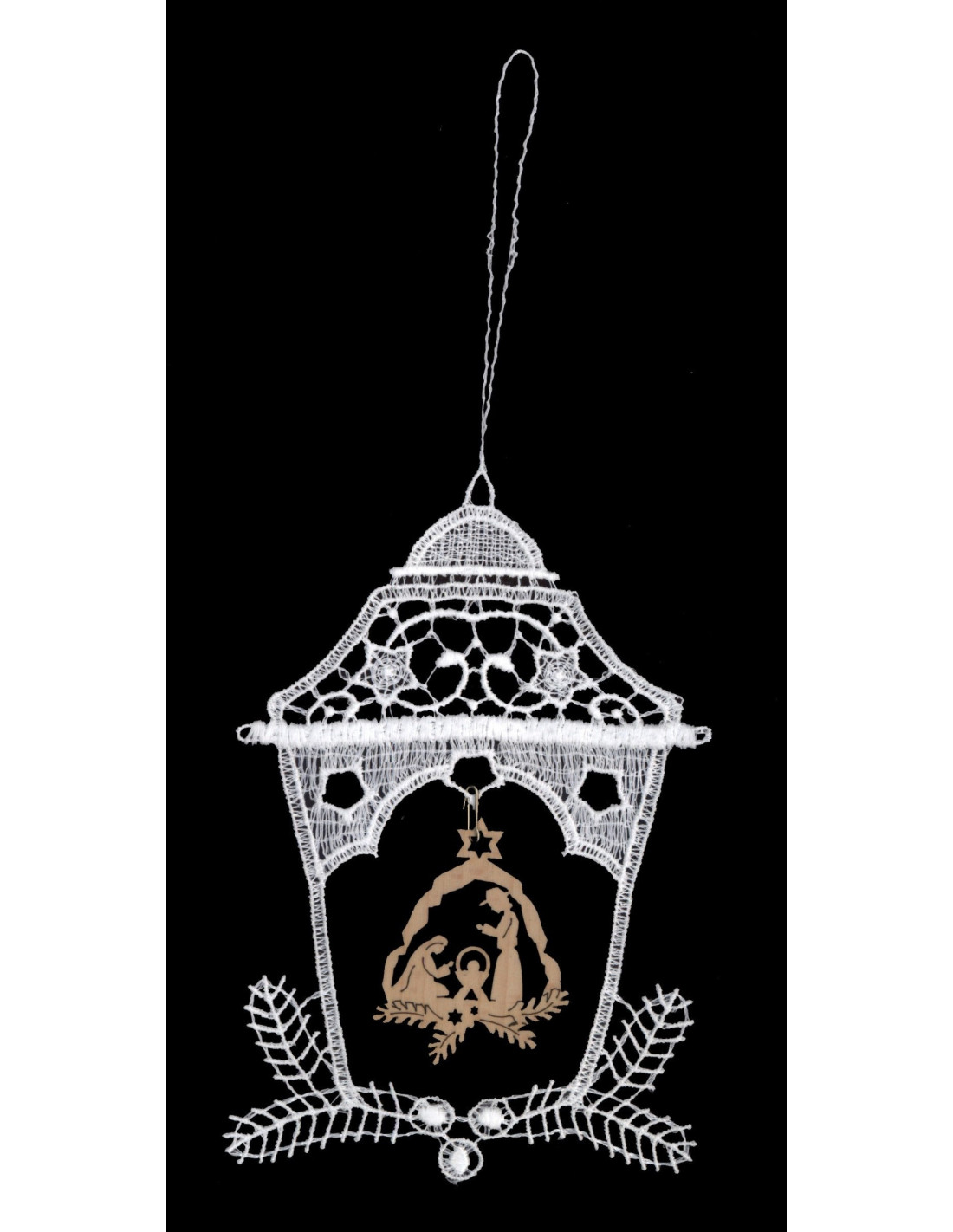 Kantklos ornament met houten ornament lantaarn met kerststal. Ca 11cm hoog. Met hanglintje.