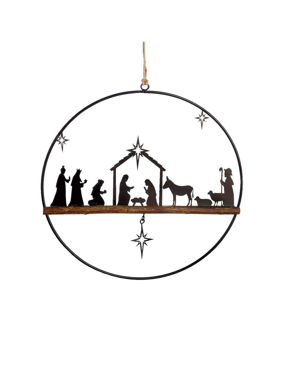 Kersttafereel in ring om op te hangen. Doorsnede 30cm. Tafereel is van metaal op houten balkje.