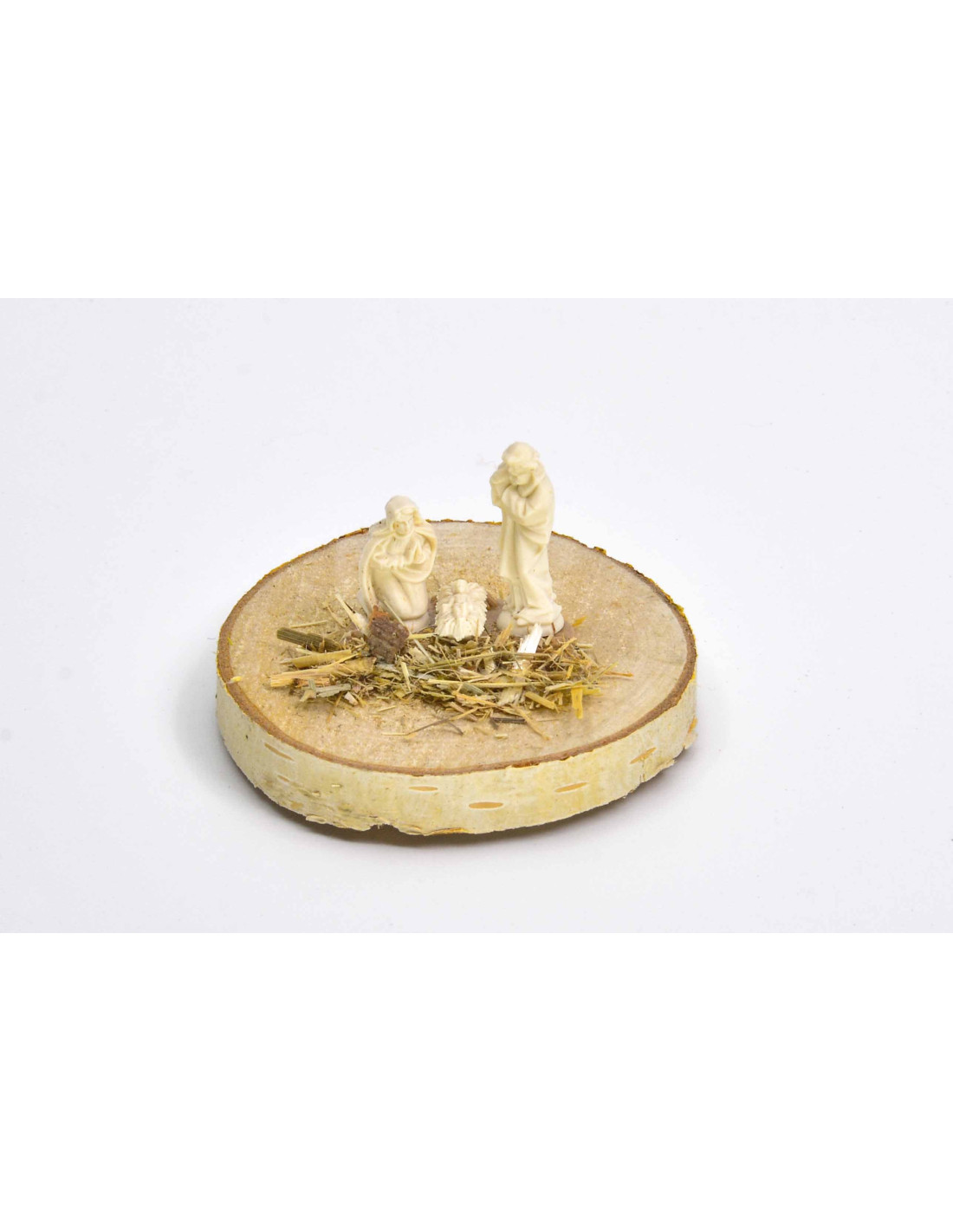 Kerstfiguur op houten boomschijf Maria Jozef Jezus Tekst: Gods zegen.