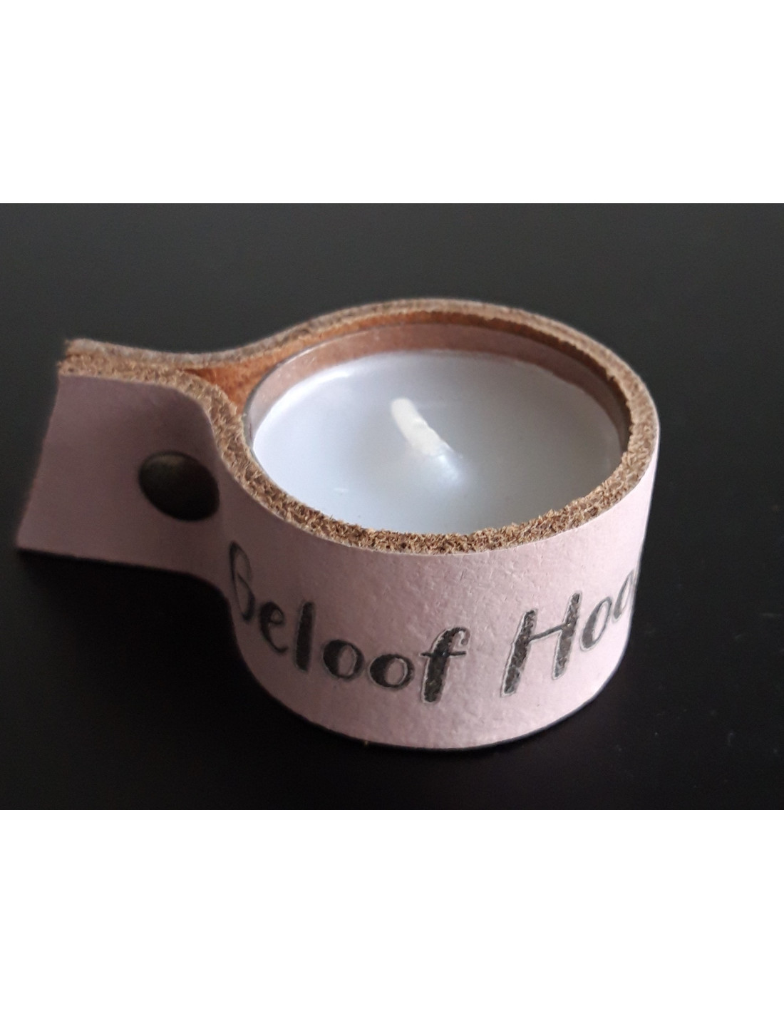 Leren waxinelichtjeshouder oud roze met tekst Geloof, Hoop, Liefde. Hervulbaar voor oneidige sfeer in je huis!