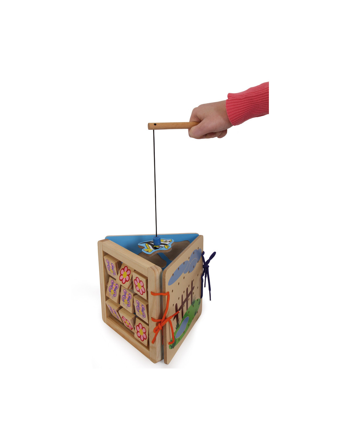 Veel plezier met veel afwisseling: kleurrijke zeedieren kunnen worden gevangen met de magnetische hengel. Vis, koe en varken zijn vastgebonden aan de boerderij of de vijver van het rijgspel. Ook het draaiende spel met bloemen en vlinders bevordert de motoriek. De houten spellen zijn samengebonden en gemakkelijk te vervoeren met acht magnetische onderdelen en vijf koorden.